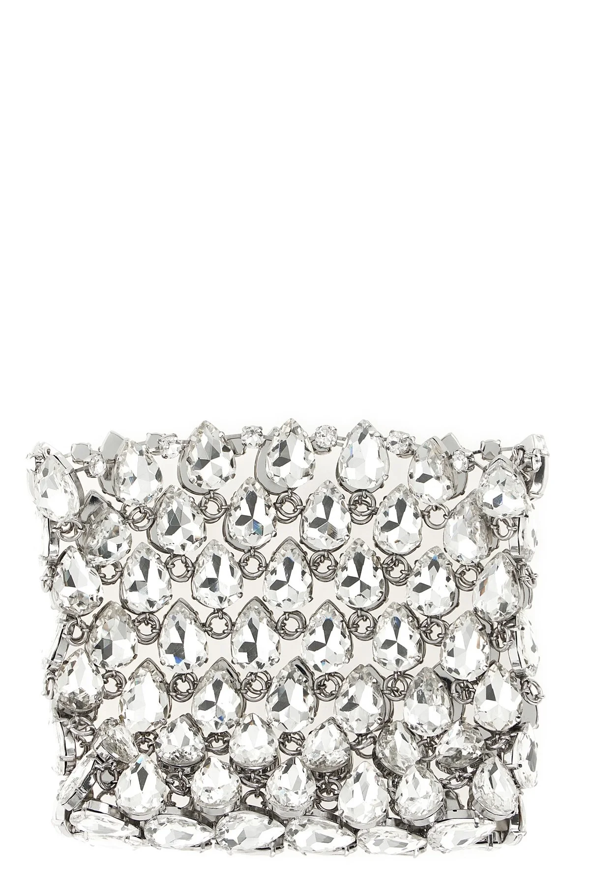 cod. SS26310SLSILVER 'Silver Crystal Chainmail Mini' clutch bag consisting of metal mesh outer part with maxi teardrop crystal application, and satin bag inner part with drawstring closure, removable chain shoulder strap. Color: Multicolor Size & Fit: W 16 x H 15 x D 5 cm Composition: 100% glass Made in: China