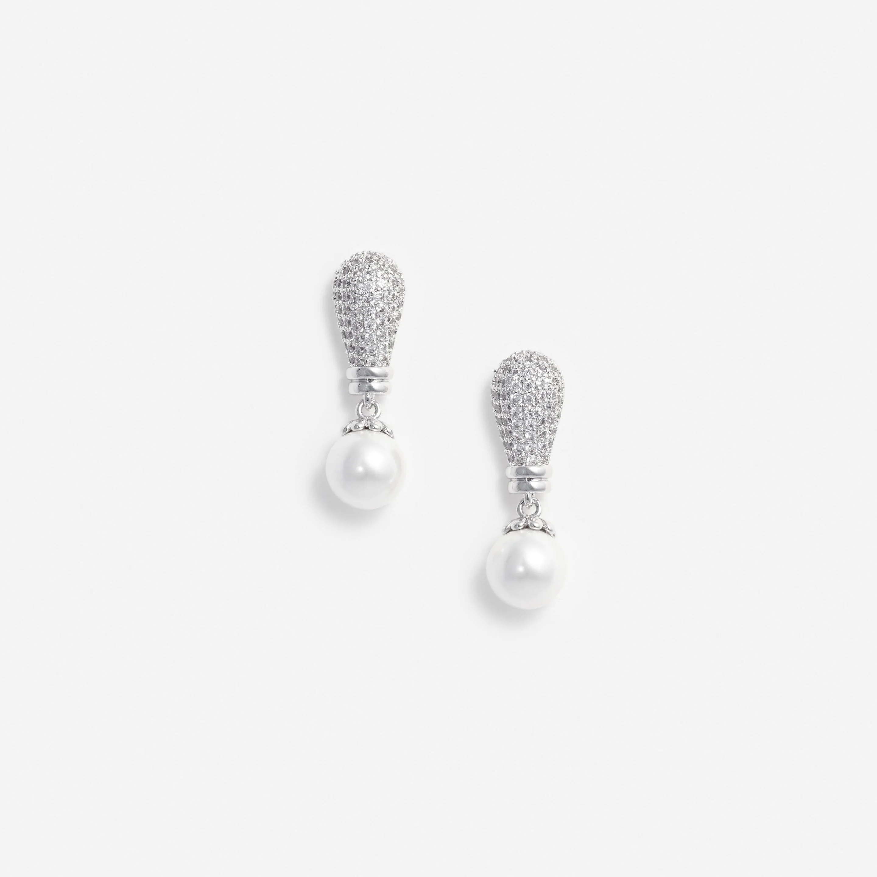 Details & Fit By marrying sleek silver forms with timeless pearls, these statement earrings toe the line between the classic and contemporary. All-over crystals add extra shine – ready for the big day. - Crystal and faux pearl embellishment - Stud backing - Length: 1.1cm Height: 3.9cm Composition Main Body1: Hypoallergenic Plated Brass + 80% Zircon + 20% Abs Pearl Accessory: 96% Brass + 2% Stainless Steel Needle + 2% Sabs Pearl