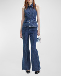 SelfPortrait denim jumpsuit with raised seams and diamante buttons Spread collar; button front Sleeveless Peplum waist Decorative front flap pockets Slim fit through hips and thigh Flared legs Full length Cotton Dry clean Imported