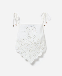 Details & Fit With a relaxed fit and tie straps, this embroidered cotton top defines boho chic. Its scalloped hem pairs effortlessly with high-waisted denim or wear with the matching skirt for a beach escape. - True to size - Relaxed fit - Tie-up spaghetti straps - Unlined style - Matching bottoms available - Model is 5ft10/178cm and wears a size UK 6 COMPOSITION Main Fabric: 100% Cotton