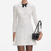 Details & Fit A front bib detail adds a stylish accent to this lace knit mini dress. Topped with a removable bow brooch, pair this ultra-feminine look with ballet flats for work drinks or nights at the opera. - True to size - Fabric has stretch - Concealed button closure down front - Lace bib detail - Removable bow brooch - Model is 5ft10/178cm and wears a size S Composition Main: 77% Cotton 16% Polyester 6% Polyamide 1% Elastane Contrast: 100% Polyester Collar: 85% Polyester 15% Polyamide (Exclusive Of Trimmings)
