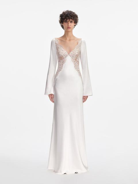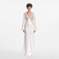 Details & Fit Starring a lace topped bodice, this satin maxi’s sensual form, elegant long sleeves and V-neckline make it ideal for festive and bridal parties alike. Pair with heels to make a sweeping entrance. - Fitted style, take one size up if between sizes - This style has minimal stretch - Concealed zip closure at back - Unlined style - Model is 5ft10/178cm and wears a size US 2 - Check the Size Guide to find your perfect fit COMPOSITION Main Fabric: 100% Polyester Contrast: 52% Polyamide 48% Cotton Lining: 87% Polyester 13% Elastane