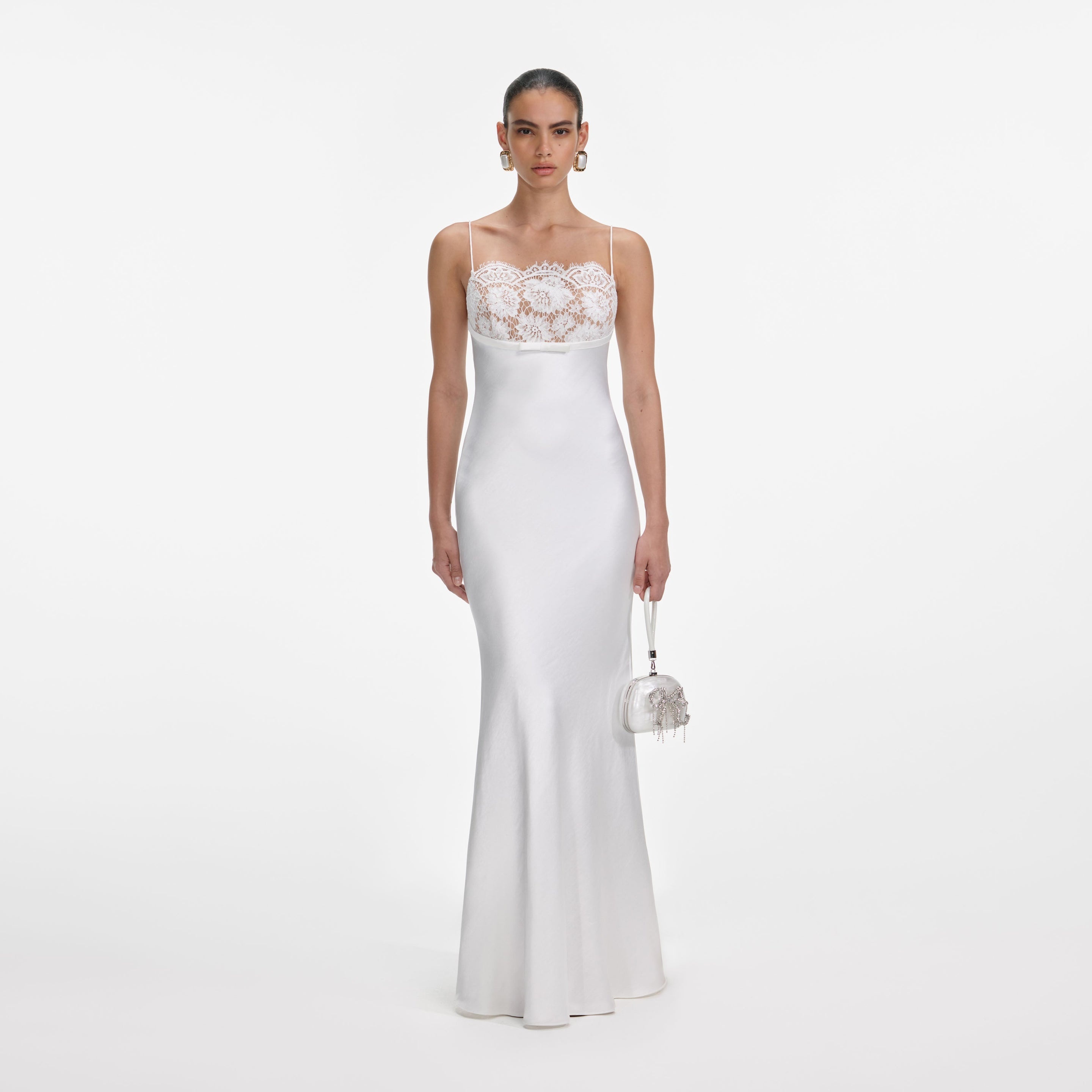 Details & Fit Channel 90s minimalism in this white satin maxi dress, which boasts a bow-topped neckline. Lace detailing adds an element of intrigue – style its flowing skirt with heels to sweep down the aisle.Channel 90s minimalism in this white satin maxi dress, which boasts a bow-topped neckline. Lace detailing adds an element of intrigue – style its flowing skirt with heels to sweep down the aisle. - Fitted style, take one size up if between sizes - This style has minimal stretch - Contrast lace at bust - Nude lining at bust - Delicate spaghetti straps - Model is 5ft10/178cm and wears a size UK 6 - Fitted style, take one size up if between sizes - This style has minimal stretch - Contrast lace at bust - Nude lining at bust - Delicate spaghetti straps - Model is 5ft10/178cm and wears a size UK 6 COMPOSITION 54%Recycled 46%Polyester 54%Recycled 46%Polyester