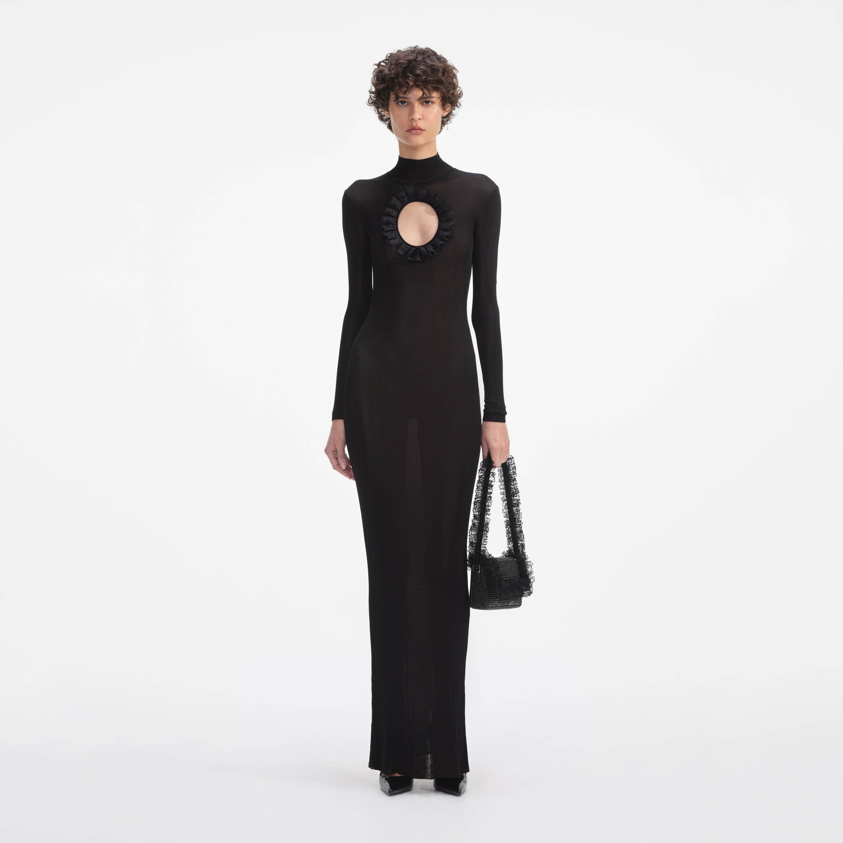Details & Fit Chic minimalism with a provocative edge, this lightweight knit dress stars a central cut-out for a sensual glimpse of skin. Enhance its elegant high neck with a pair of our statement earrings. - True to size - Fabric has stretch - Cut-out at front - Black lace ruffle detailing - Model is 5ft10/178cm and wears a size UK 6 - Check the Size Guide to find your perfect fit COMPOSITION Main: 100% Viscose Lace: 100% Polyamide