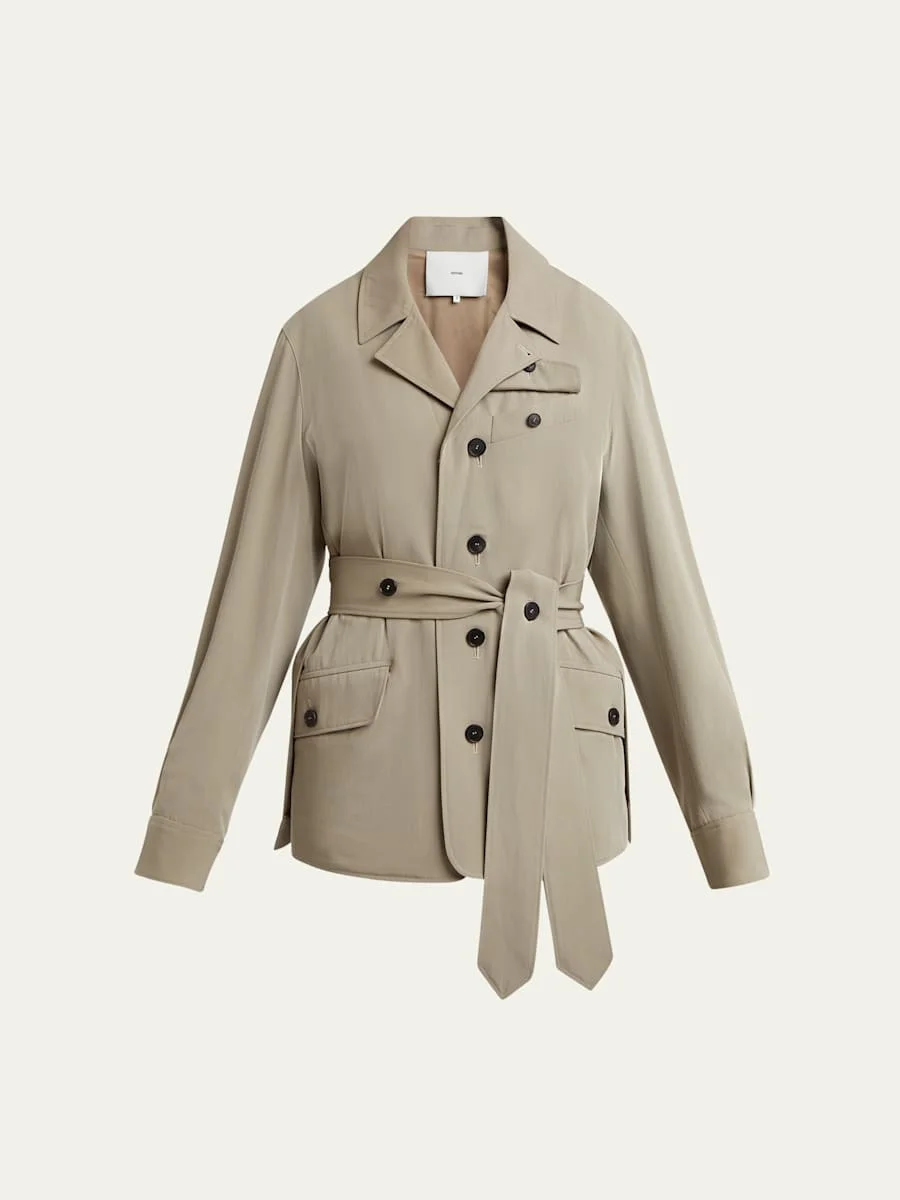 SETCHU travel safari jacket Approx. 29"L from shoulder to hem Notch lapels; button front Long sleeves; button cuffs Chest pocket; waist flap pockets Relaxed fit Self-tie waist belt Virgin wool/cotton Made in Italy Online Inquiries: BGS21_B9KNP| Store Inquiries: #4894450