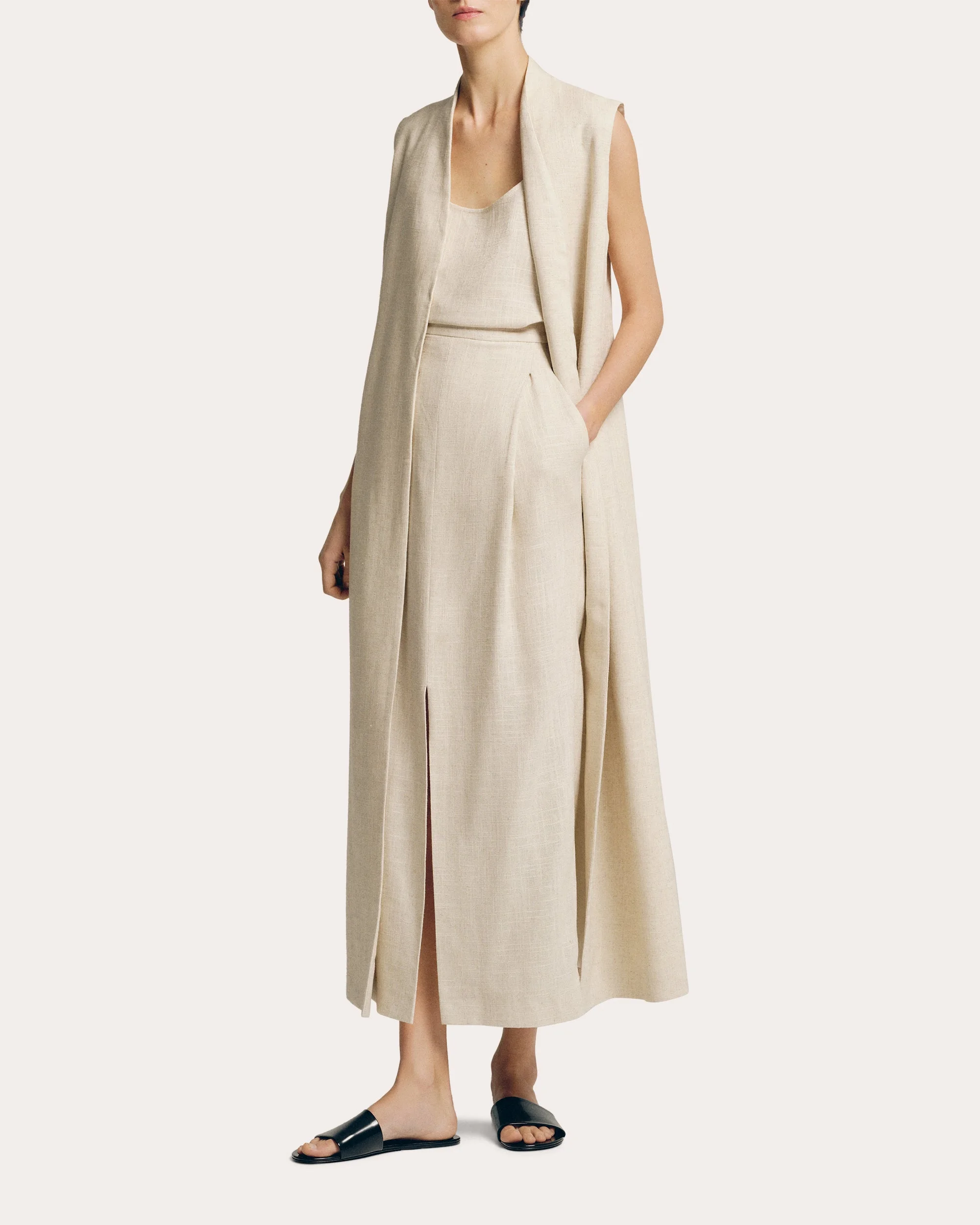 Crafted from neutral-hued linen, this maxi-length vest pairs its shawl collar with a single button fastening to reflect tailored appeal. Pair with Sophie et Viola's Linen Tank Top and Linen Wide-Leg Pants in Sand for monochromatic styling. Designer color name: Sand Button closure Shawl collar Vented back hem Self: 70% linen, 30% viscose Lining: 100% polyester Dry clean Made in Spain Size & Fit Please note, below measurements reflect Sophie et Viola's size chart, not the actual garment. Size XS (US 2): 31.49in bust, 23.62in waist, 34.64in hips Size S (US 4): 33.07in bust, 25.19in waist, 36.22in hips Size M (US 6): 34.64in bust, 26.77in waist, 37.79in hips Size L (US 8): 36.22in bust, 28.5in waist, 39.37in hips Size XL (US 10): 37.79in bust, 30.23in waist, 40.94in hips