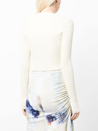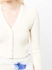 V-neck ribbed cardigan Highlights - Cream white - Wool blend - Ribbed knit - V-neck - Front button fastening - Long sleeves - Straight hem - Cropped Made in Italy Composition Wool 90%, Polyester 10% SIZE & FIT Model measurements Height 5 ft 9 in(1.76 m) Bust/Chest 31.1 in(79 cm) Hips 35.03 in(89 cm) Waist 24.4 in(62 cm) FittingInformation Designed for a close fit throughout Cropped in length Made with a midweight knit, this piece offers some stretch This piece fits large – take one size down