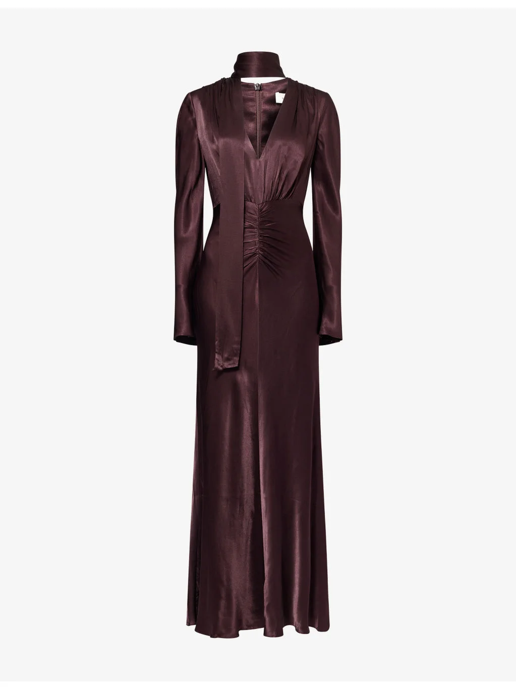 PRODUCT DETAILS - Shona Joy satin maxi dress - 100% viscose; lining 100% polyester - Concealed zip fastening at back - Regular fit, v-neck, removable neck scarf, long flared sleeves, fitted gathered waistband, split hem at front - Hand wash - True to size - Size UK 10: length 58in / 147.5cm - Model is 5ft 10in / 1.78m and wears a size UK 10 - Lightweight, non-stretch Ref: R04608626
