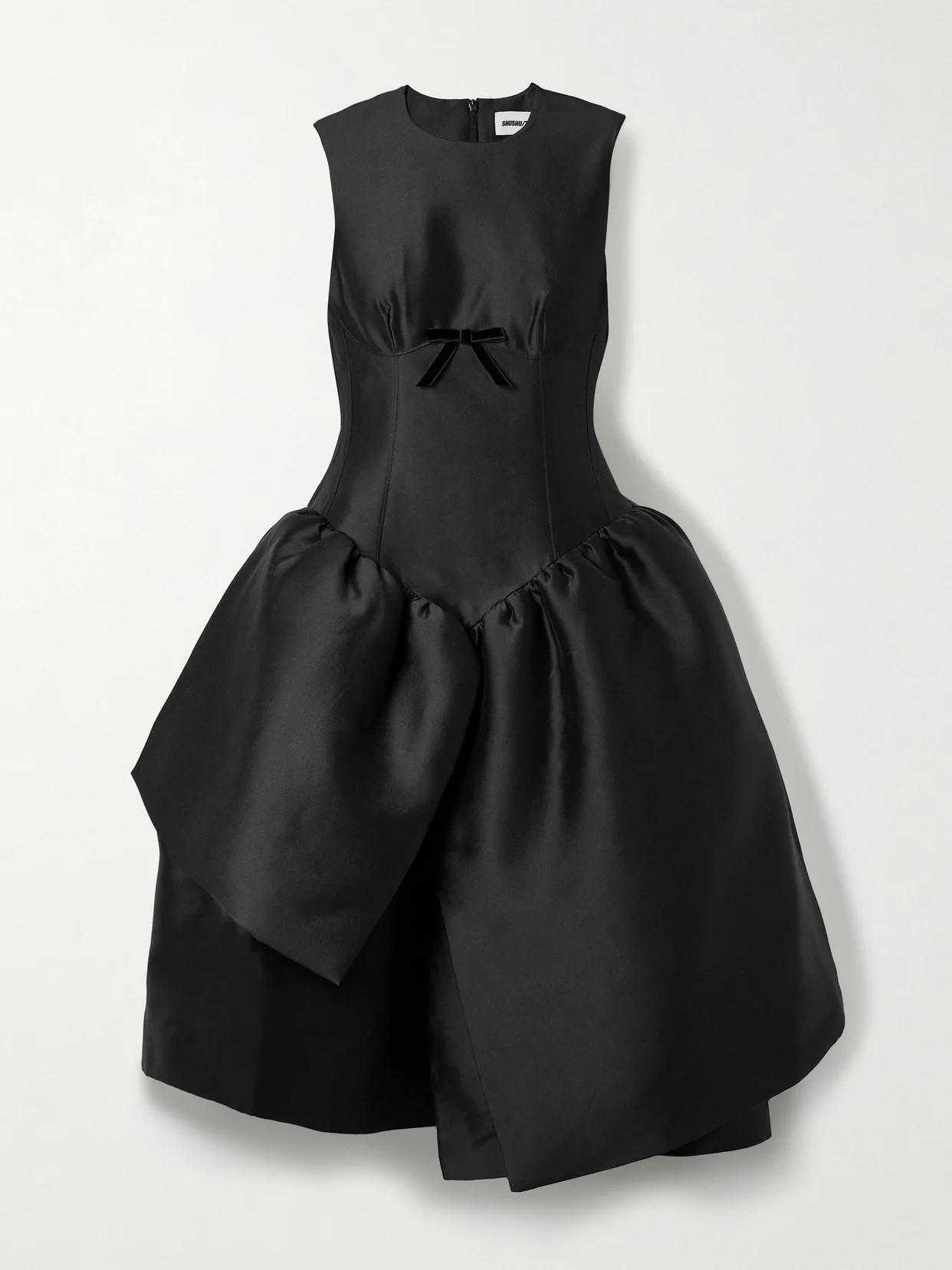 SHUSHU/TONG's dress has a corset-inspired waist that creates an hourglass shape. It's made from shiny black taffeta and falls to a layered, voluminous skirt with an asymmetric hem. Match the velvet bow on the bust with a coordinating one in your hair.