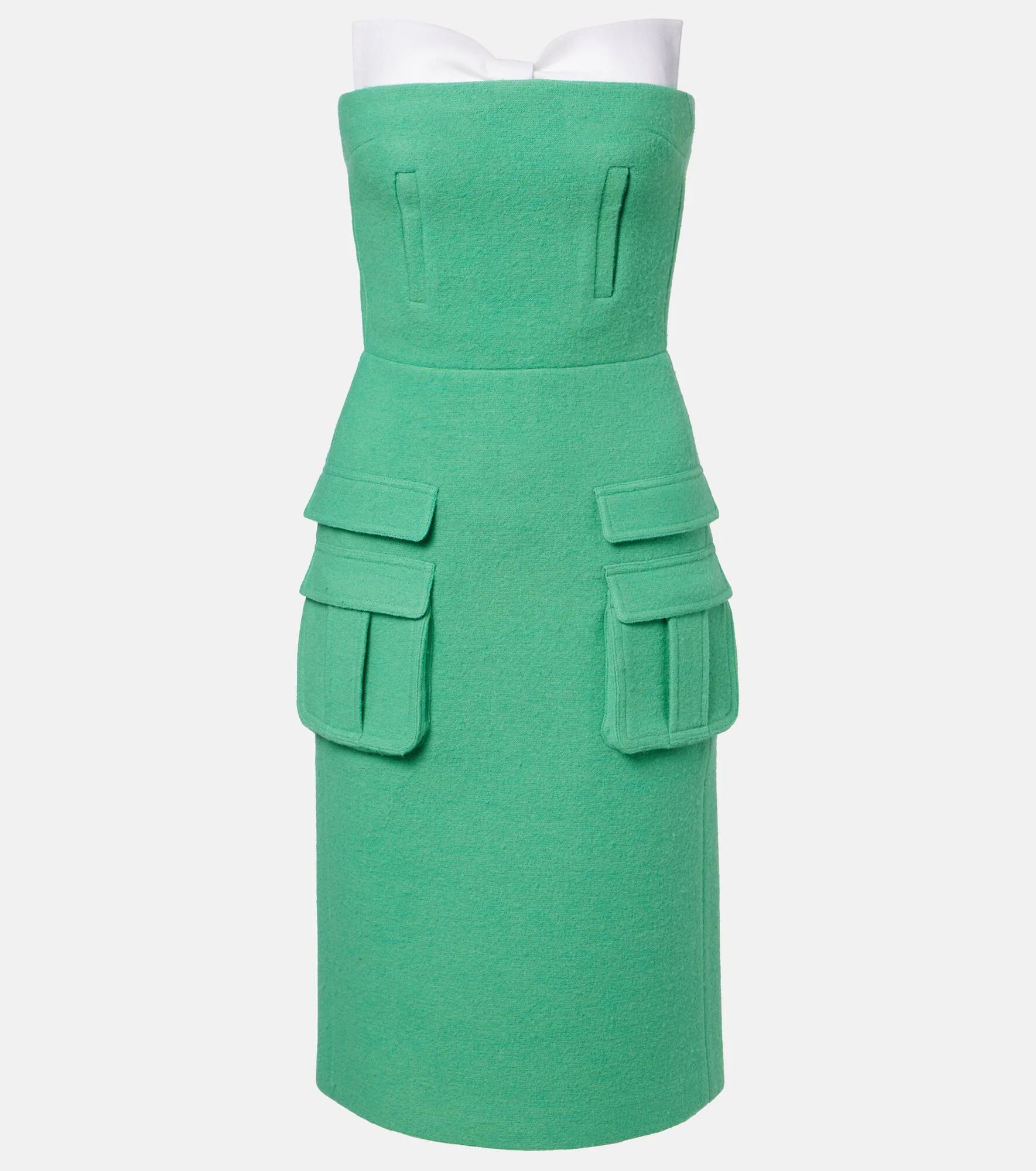 Shushu/Tong fuses classic and contemporary codes to create unique designs, like this midi dress. Made from heavy wool to a strapless silhouette, the style features bow detailing at the neckline juxtaposed with utilitarian-style pockets. Product Details - Material: 100% wool - Care instructions: dry clean - Made in Japan - Designer color name: Aqua Green - Item color: green - Material II: 50% wool, 50% linen - Interlining: 100% polyester - Lining: 100% polyester - Lining II: 85% polyamide, 15% elastane - Pockets: welt pockets, flap pockets - Closure: concealed zipped back, hook-fastening back - Short vent - Item number: P01093432 Size & Fit - True to size - Strapless - Internal boned corset for support - Fitted - Non-stretchy fabric - The model seen in the picture is 178cm-5'10" and wearing a size UK 8