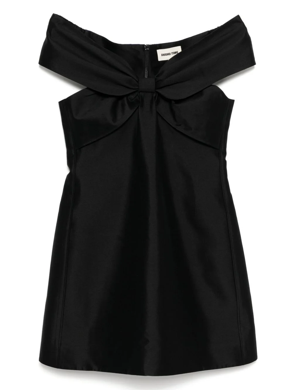 bow mini dress Highlights - Black - Rear zip fastening - Two adjustable detachable shoulder straps - Smocked panel Imported Composition Wool 56%, Silk 44% SIZE & FIT Model measurements Height 5 ft 10 in(1.78 m) Bust/Chest 29.92 in(76 cm) Hips 34.64 in(88 cm) Waist 24.8 in(63 cm) FittingInformation Designed for a close fit at the chest and waist with a loose fit at the hip The internal bodice offers support and shape Made from a midweight non-stretch fabric Washing instructions Dry Clean Only