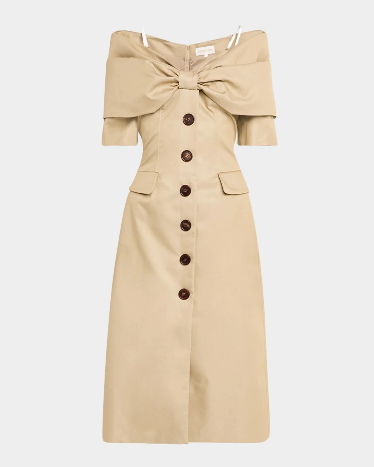 - SHUSHU/TONG button-front midi dress featuring an off-the-shoulder bow neckline - Short sleeves - Hip flap pockets - A-line silhouette - Walking vent - Invisible back zip - Polyester - Imported