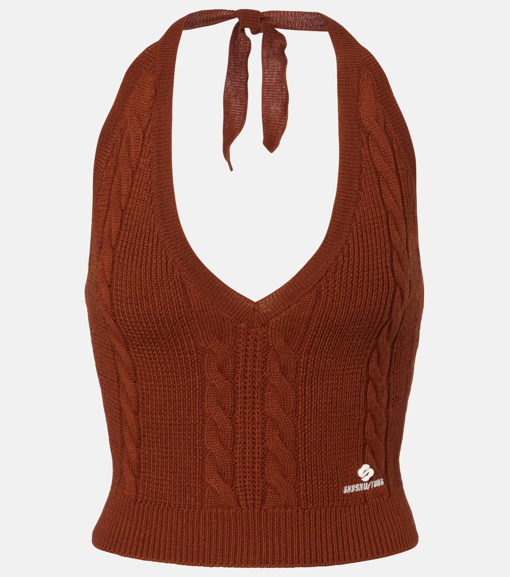 Blending classic design codes with a contemporary perspective, Shushu/Tong creates pieces that are both rebellious and unabashedly soft. This halterneck top is cable-knit from pure wool with contrast logo detailing at the hem. Product Details - Material: 100% wool - Care instructions: dry clean - Made in Japan - Designer color name: Brown - Item color: brown - Details: 100% wool - Self-tie back - Hem: ribbed - Item number: P01093419 Size & Fit - True to size - Fitted - Non-stretchy fabric - Slightly cropped - The model seen in the picture is 178cm-5'10" and wearing a size UK 8
