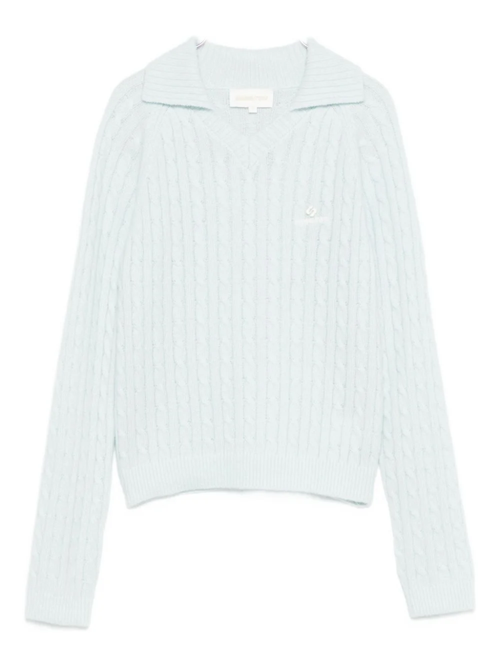 cable-knit top Highlights - Powder blue - Cable-knit construction - Wingtip collar - Long sleeves - Logo detail - Ribbed trim Imported Composition Body: Cashmere 65%, Cotton 35%