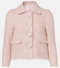 Shushu/Tong brings a new dimension to the coquette aesthetic. Made from cotton-blend tweed, this minimalist jacket is finished with darling details like the rounded collar, the fringed hemlines, and oversized self-covered buttons. Product Details - Material: 75.6% cotton, 24.4% polyester - Care instructions: dry clean - Made in Japan - Color: pink - Designer color name: Pink - Lining: 100% polyester - Interlining: 100% polyester - Closure: buttoned front - Pockets: flap pockets - Item number: P01162561 Size & Fit - True to size - Straight fit - Non-stretchy fabric - Slightly cropped - The model seen in the picture is 178cm-5'10" and wearing a size UK 6