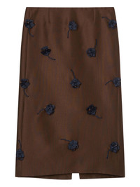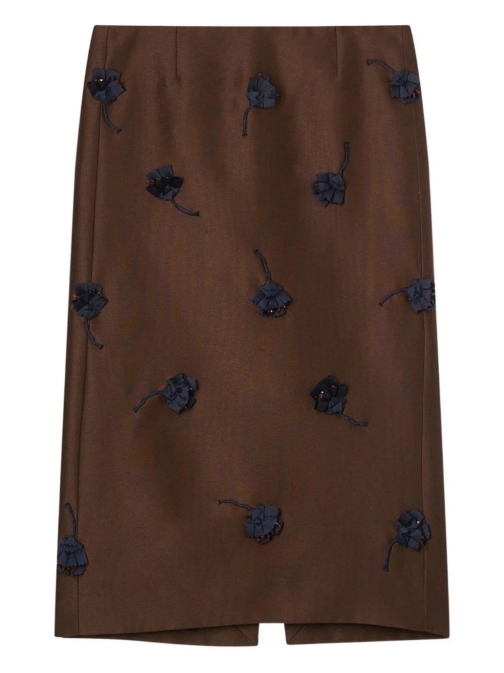 floral applique mid skirt Highlights - Brown - Floral applique - Back zip fastening - Back slit Imported Composition Polyester 100% Washing instructions Read Manufacturer Guidelines