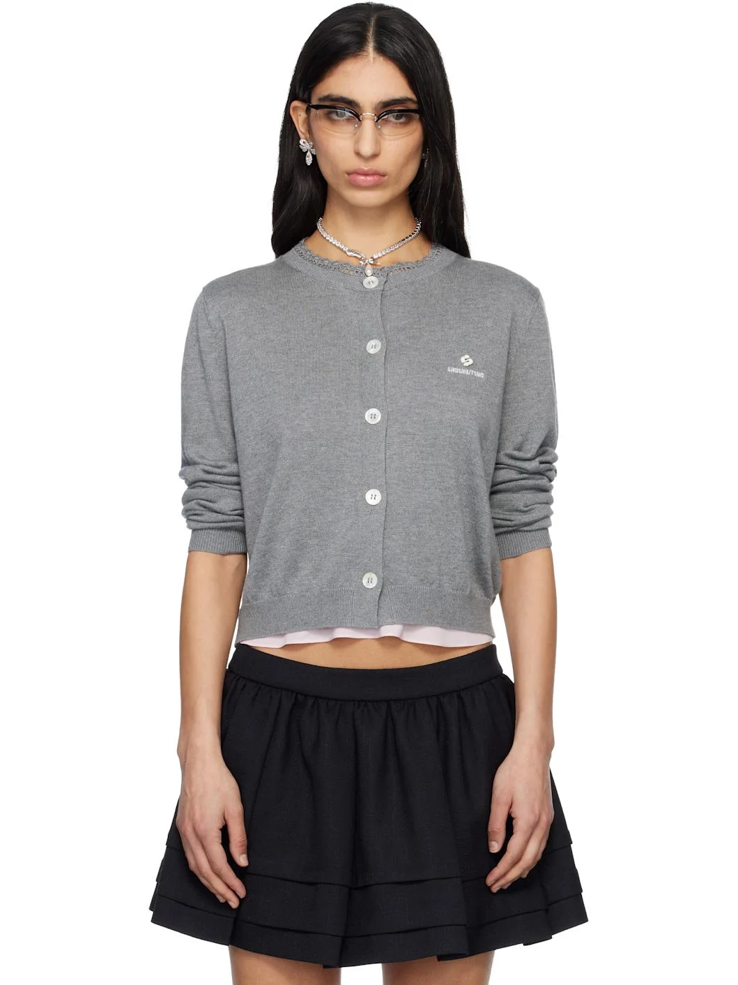 Knit silk- and cashmere-blend cardigan. · Rib-knit round neck, hem, and cuffs · Lace-trim at collar · Button closure · Logo hardware and embroidered logo at chest Supplier color: Grey 84.8% silk, 15.2% cashmere. Made in Japan 261901F095002