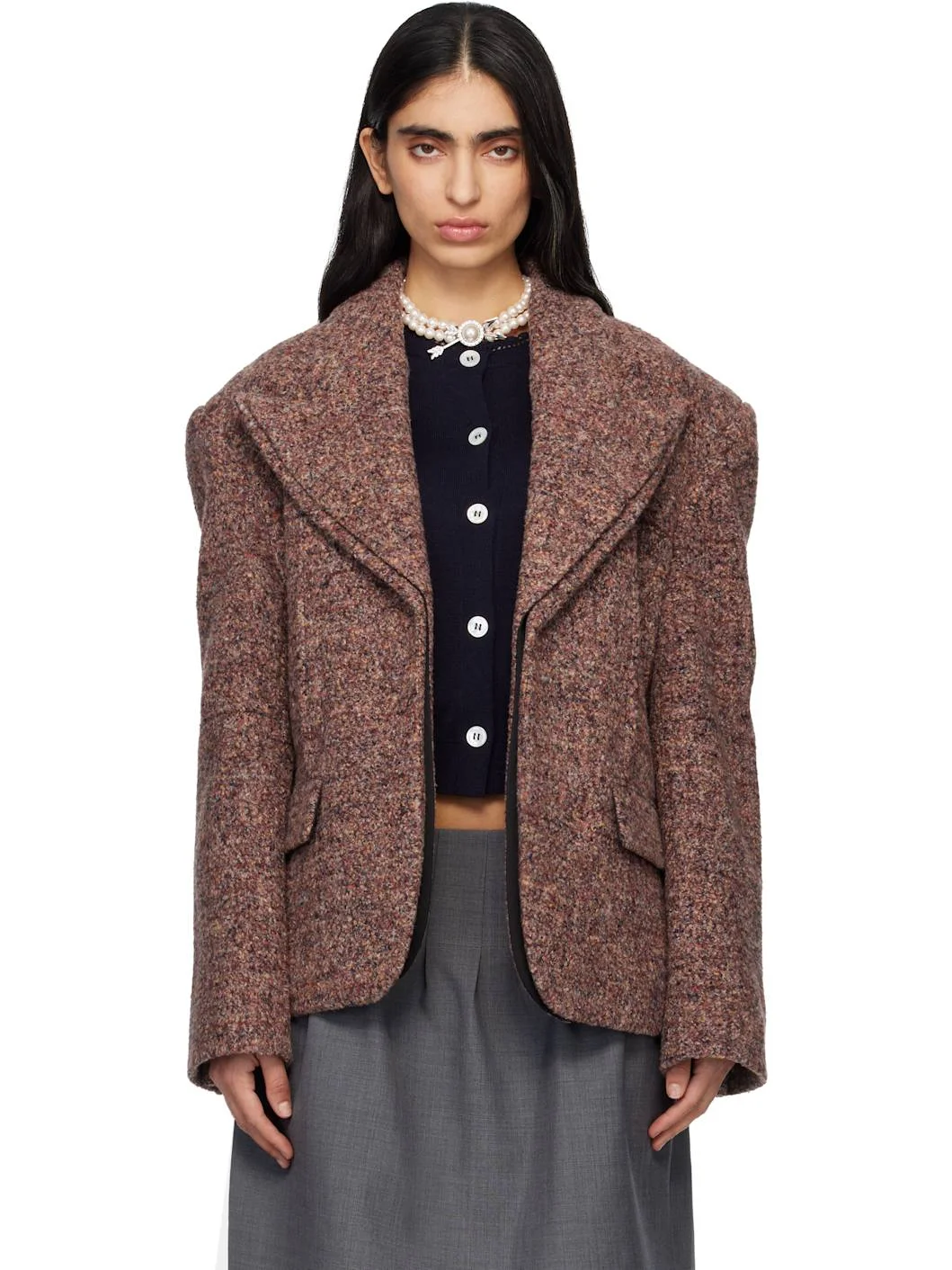 Viscose- and wool-blend tweed blazer. · Detachable overlay at peaked lapel · Pinched seams at front and sleeves · Flap pockets at waist · Central vent at back hem · Full twill lining Supplier color: Variedness Body: 55.3% polyester, 24.2% viscose, 20.5% wool. Lining: 100% polyester. Made in Japan 261901F057002