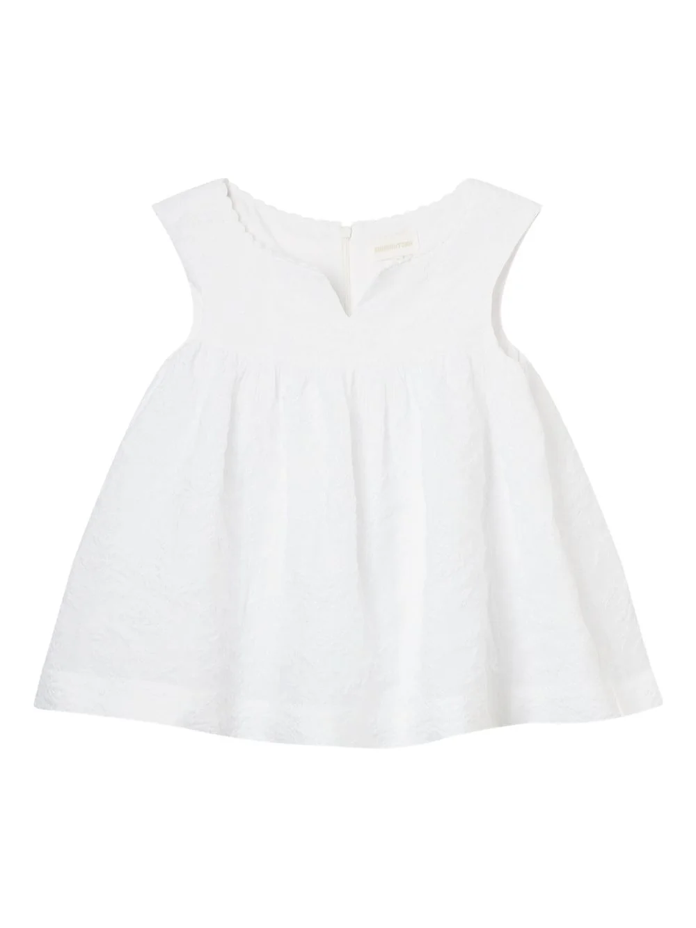 textured V-neck top Highlights - White - Textured finish - V-neck - Scalloped trim - Sleeveless - Zip fastening Imported Composition Cotton 57%, Polyamide 43% Washing instructions Read Manufacturer Guidelines