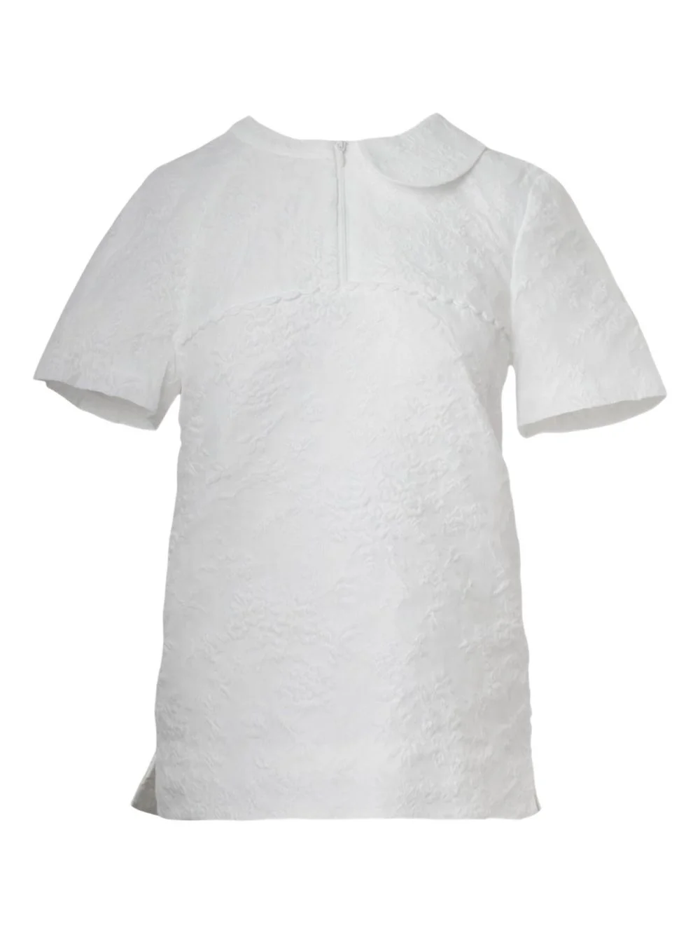semi-peter pan collar top Highlights - White - Textured effect - Short sleeves - Rear zip fastening - Semi-peter pan collar - Braid detail Imported Composition Fabric 100% Washing instructions Read Manufacturer Guidelines
