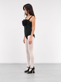 SHUSHU/TONG bodysuit in black, wool-nylon blend, paneled construction, all-over sequin embellishment, sweetheart neckline, shoulder straps, sleeveless, armscyes, back concealed zip closure, bust lace embellishment, low-cut, form fit. Outer: 74.6% Wool 25.4% Polyamide Inner: 100% Polyester UK Sizing Model is 5'8" wearing size 6. Bust: 32" Waist: 24" Hips: 33"
