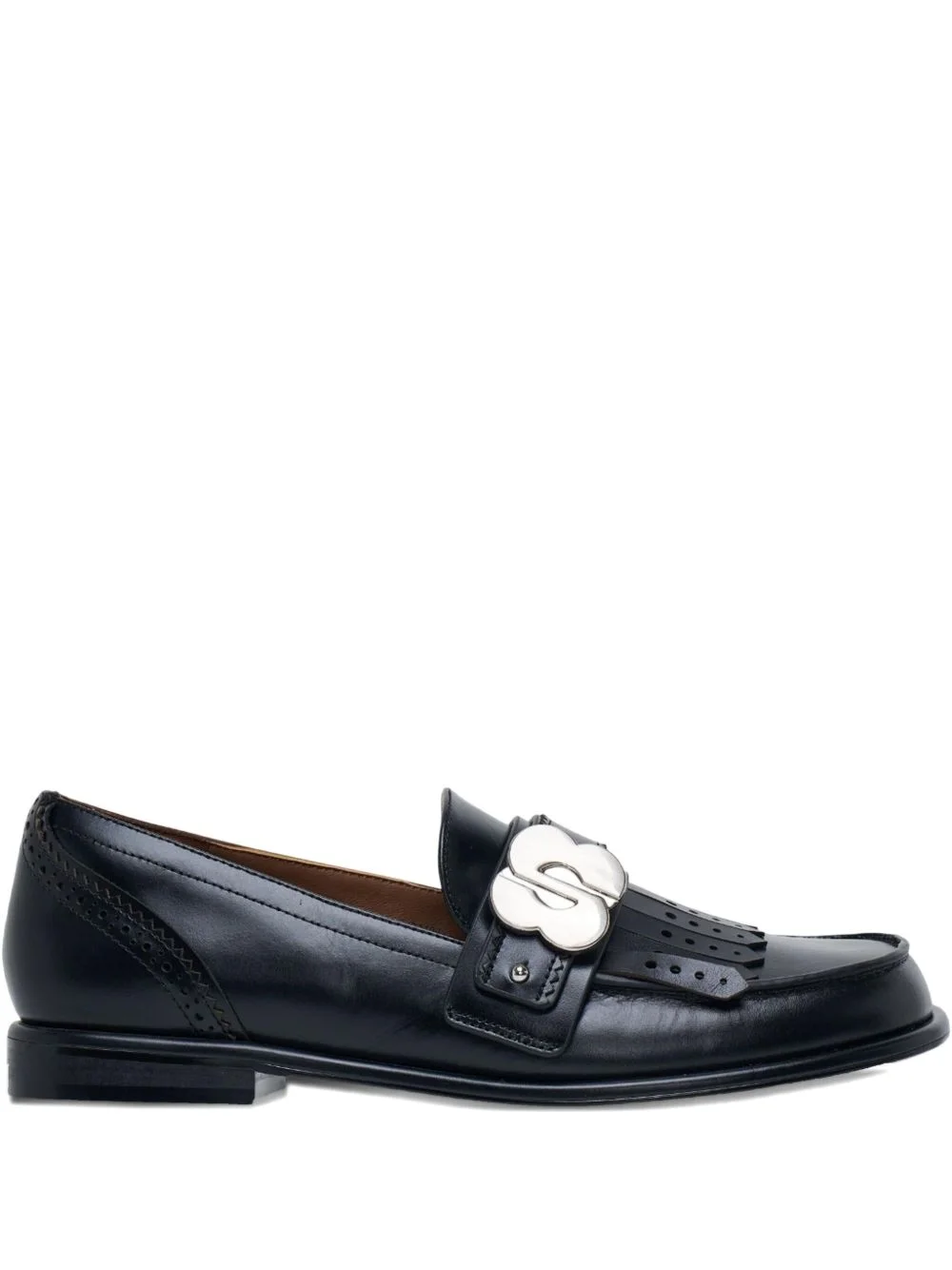 flower square-toe loafers Highlights - Black - Flower detail - Fringe detail - Square toe - Flat sole - Brogue detailing Imported Composition Lining: Calf Leather 100% Outer: Calf Leather 100% Sole: Calf Leather 100%