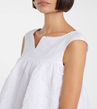 Blending classic design codes with a contemporary perspective, Shushu/Tong creates pieces that are both rebellious and unabashedly soft. This sleeveless, textured top is shaped into a voluminous silhouette with a notched square neckline and flared hem. Product Details - Material: 43.1% cotton, 41.1% polyamide, 15.8% polyester - Care instructions: dry clean - Made in Japan - Designer color name: White - Item color: white - Lining: 100% polyester - Closure: zipped back - Item number: P01093411 Size & Fit - True to size - Designed for a loose fit - Non-stretchy fabric - Falls to the hip - The model seen in the picture is 178cm-5'10" and wearing a size UK 8