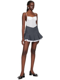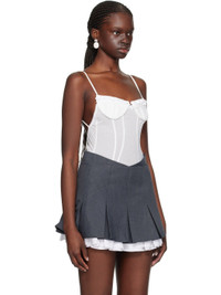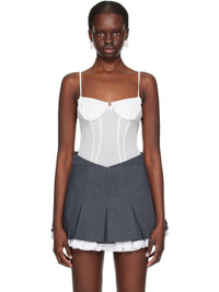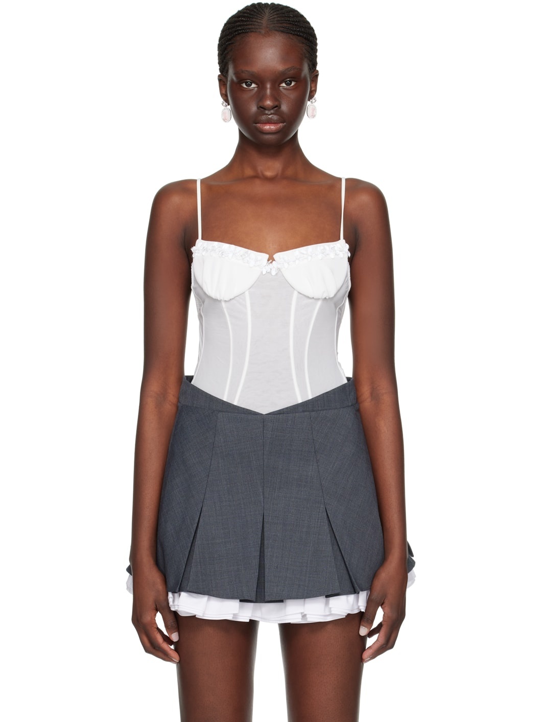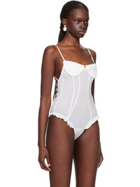 Semi-sheer polyester jersey bodysuit. · Paneled construction · Sweetheart neck · Sequinned floral appliqués at padded cups · Ruffled trim at hem · Hook-eye fastening at bottom · Adjustable shoulder straps · Zip closure at back · Partially lined Supplier color: White