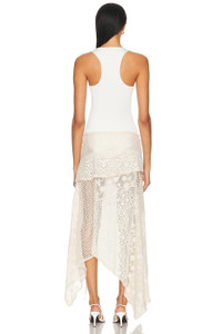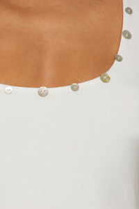 Details - Self 1: 70% cotton, 30% polyamide - Self 2: 99% cotton, 1% elastane - Self 3: 95% polyester, 5% elastane - Dry clean only - Partially lined - Front tie-up closure - Gusset button snap closure - Front scoop neckline with button accents - Jersey fabric at top - Crochet asymmetrical fabric design at skirt - Made in Turkey - Our Style No. SEDF-WD81 - Manufacturer Style No. WSS25DR17