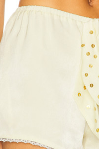 - 100% polyester - Hand wash - Elastic waistband - Bow accent with light sequin embellishments - Midweight satin fabric with lace trim - Shorts measure approx 11" in length - Revolve Style No. SRER-WF15 - Manufacturer Style No. WPF25BT13