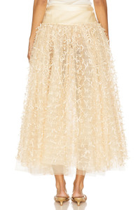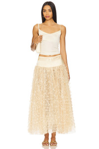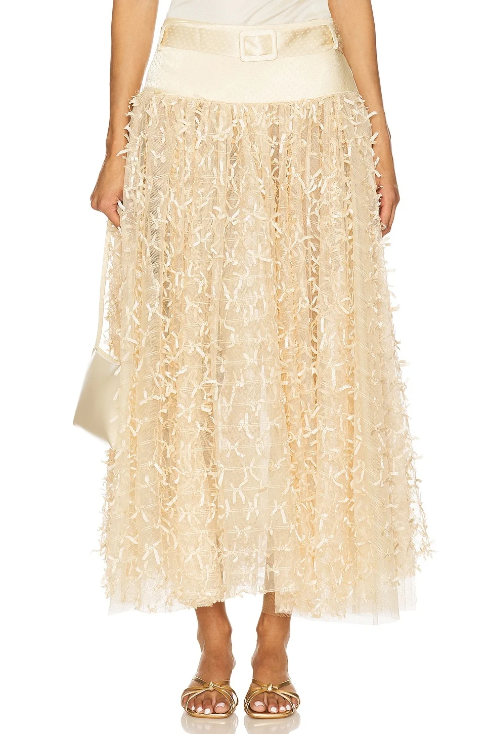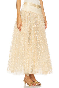 - Self: 100% polyester Contrast Fabric: 100% viscose - Dry clean only - Fully lined - Concealed side zipper with hook and eye closure - Detachable waist belt - Bow detailing throughout - Midweight tulle fabric - Skirt measures approx 38" in length - Revolve Style No. SRER-WQ20 - Manufacturer Style No. WSS25BT31