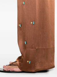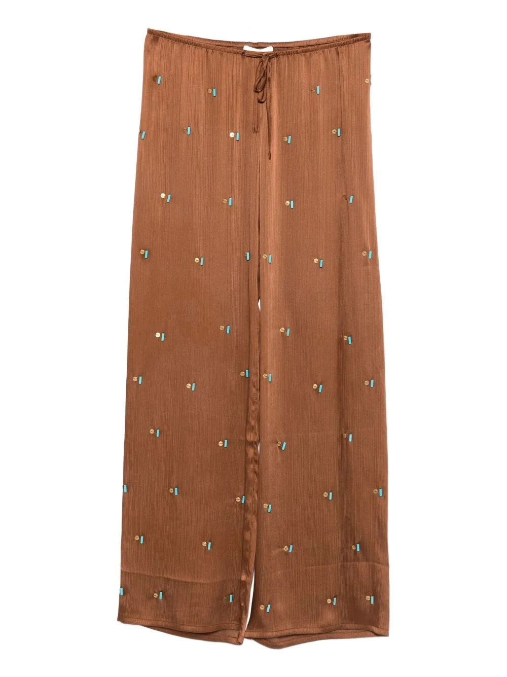 Manoce embellished drawstring trousers Highlights - Brown - Satin texture - Gold embellishments - Turquoise embellishments - Drawstring waist Imported Composition Polyester 100% SIZE & FIT Model measurements Height 5 ft 10 in(1.78 m) Bust/Chest 33.46 in(85 cm) Hips 36.22 in(92 cm) Waist 23.22 in(59 cm) Washing instructions Dry Clean Only