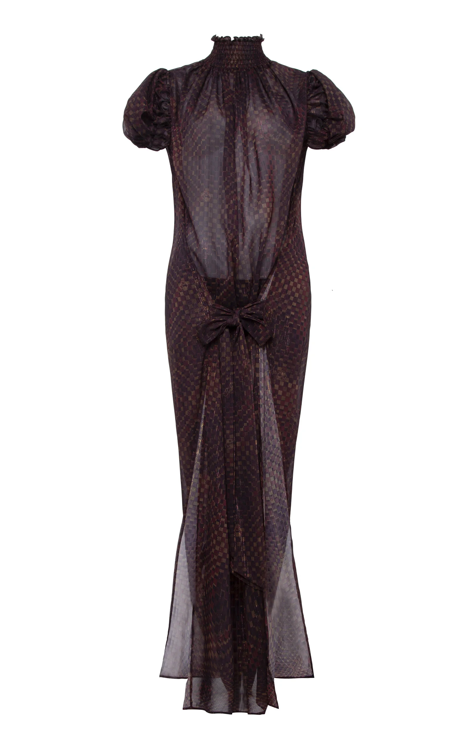 Sheer maxi dress in lightweight checkered chiffon PRODUCT DETAILS - Resort '26 - Regular fit, turtle neckline with puffed sleeves, gathered detailing throughout, checkered printed, blouson silhouette maxi - Partially Lined - Composition: 98% Polyester 2% Metal Lining: 95% Polyester 5% Elastane - Button Closure - *Hand wash; Do not bleach; Do not tumble dry; Iron low heat (110°); Dry clean any solvent except Trichloroethylene - Made in Turkey