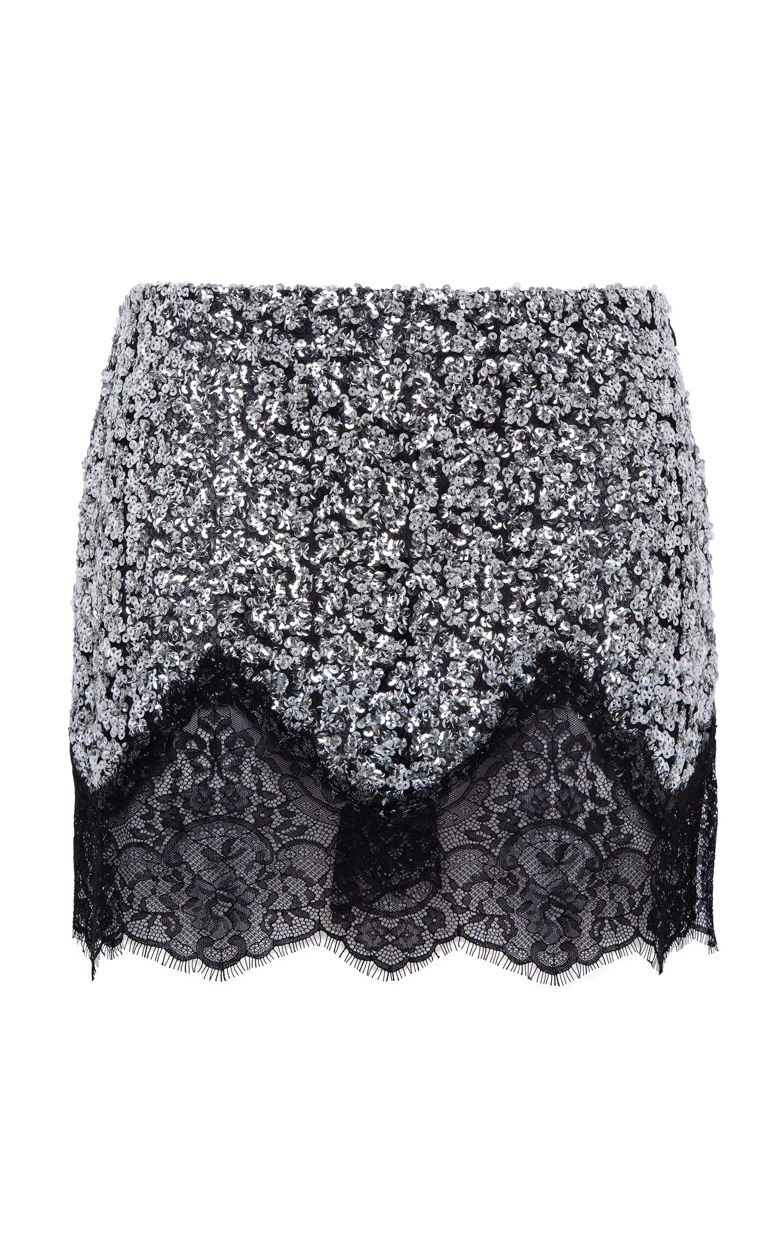Sequin mini skirt with lace trims PRODUCT DETAILS - Resort '26 - Slim fit, high rise, sequined detailing throughout, pencil cut silhouette with scallop laced hemline - Lined - Composition: 100% Polyester Details; 100% Poliamide - Zip Closure - *Do not wash; Do not bleach; Do not tumble dry; Do not iron; Dry clean any solvent except Trichloroethylene - Made in Turkey