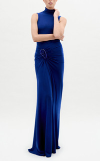 PRODUCT DETAILS - Sleeveless, high neck, hip gather with brooch, maxi hem - Concealed zip fastening - Unlined - Composition: 85% polyamide 15% elastane - Color: navy - Dry clean only - Pre-Fall '25