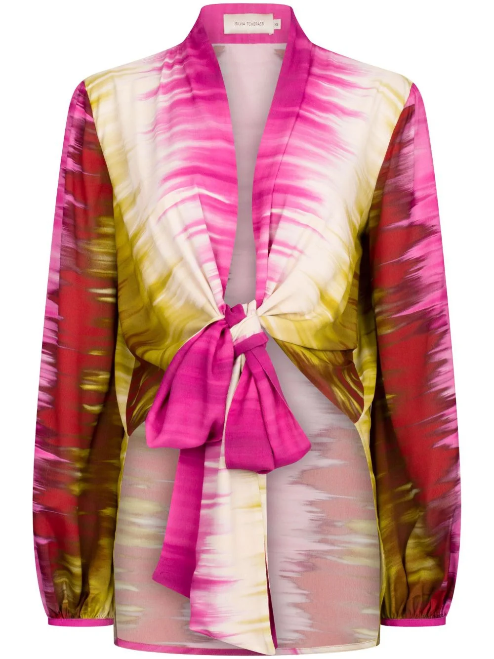 Honey blouse Highlights - Violet purple/multicolour - Lightweight construction - Front tie fastening - Tie-dye pattern - Plunging v-neck - Long sleeves - High-low hem Imported Composition Viscose 100% Washing instructions Dry Clean Only