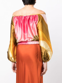 Dariella off-shoulder blouse Highlights - Light olive green/pink/multicolour - Stretch-silk - Wave print - Off-shoulder - Long puff sleeves - Elasticated cuffs - Elasticated hem Imported Composition Polyester 100% SIZE & FIT Model measurements Height 5 ft 10 in(1.77 m) Bust/Chest 31.49 in(80 cm) Hips 35.43 in(90 cm) Waist 25.19 in(64 cm) FittingInformation Designed for a loose fit at the chest with a close fit over the waist and hips The elasticated waist allows for a comfortable fit Made from a midweight non-stretch fabric This piece fits true to size – take your usual size