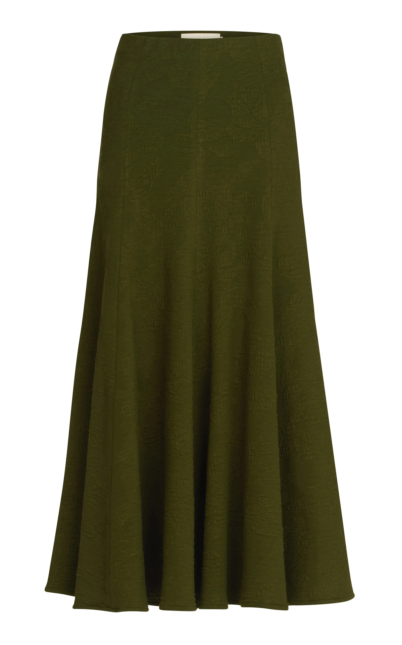 The Colombian designer crafts whimsical and feminine pieces that are imbued with unique stories rooted in her Latin upbringing. The label crafts this ‘Gilda’ skirt from a floral jacquard-knit, designed to match this season’s ‘Gen’ top. It sits closely on the waist and hips with a flared fit through the leg. PRODUCT DETAILS - Fall/Winter ‘25 - Slip on - Composition: 90% viscose, 7% polyester, 3% elastane - Dry clean - Designer Color: Hunter Green - Made in Colombia