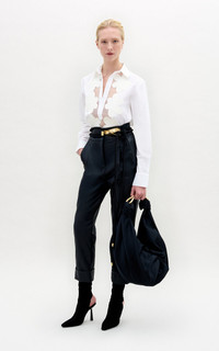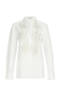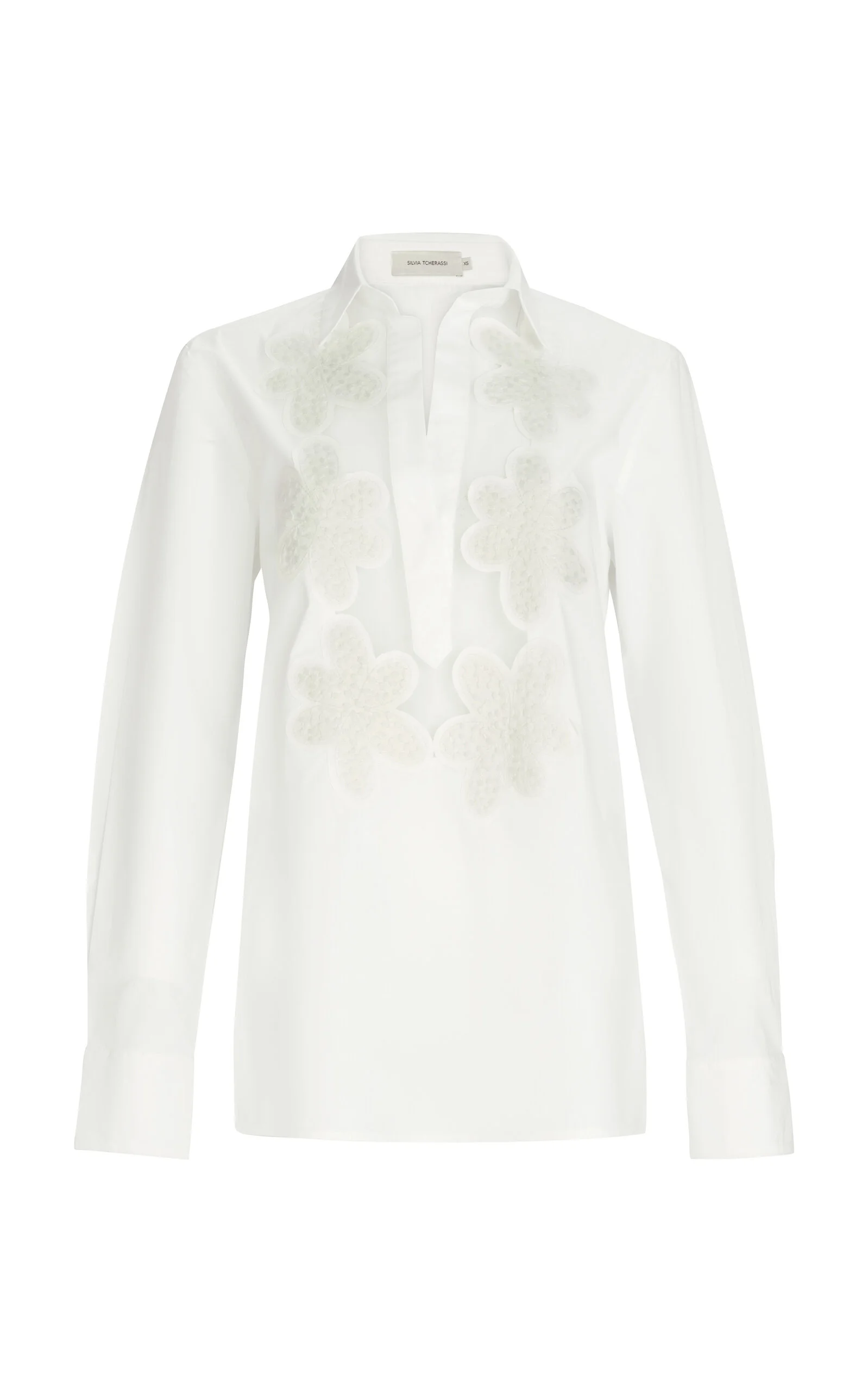 PRODUCT DETAILS - Slim fit, standard collar and long sleeve, mesh detail with floral cutouts - Front Button Closure - Unlined - Composition: 100% Cotton - Color: white - Dry Clean Only - Fall-Winter '25