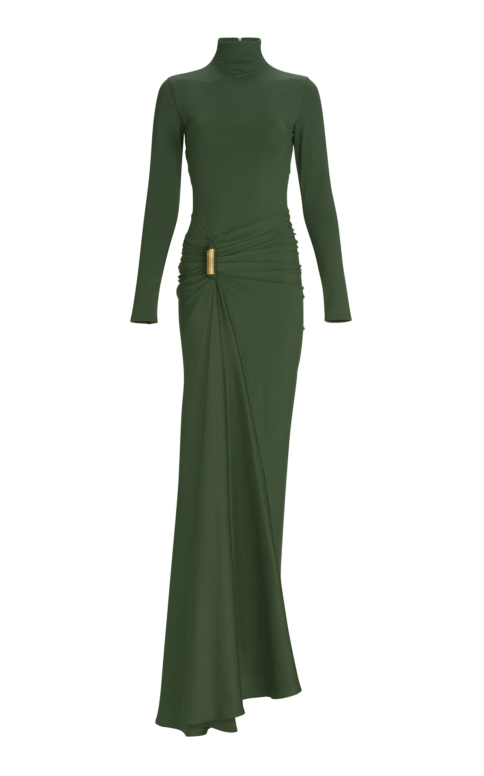 The Colombian designer crafts whimsical and feminine pieces that are imbued with unique stories rooted in her Latin upbringing. This season, ‘Lena’ is updated with new hardware and contrasting panels, while retaining its fitted, backless bodice and fishtail skirt. Match your accessories to the gold-tone finishes. PRODUCT DETAILS - Fall/Winter ‘25 - Zip fastening - Composition: 63% polyamide, 20% Silk 17% Elastane - Dry clean - Made in Colombia