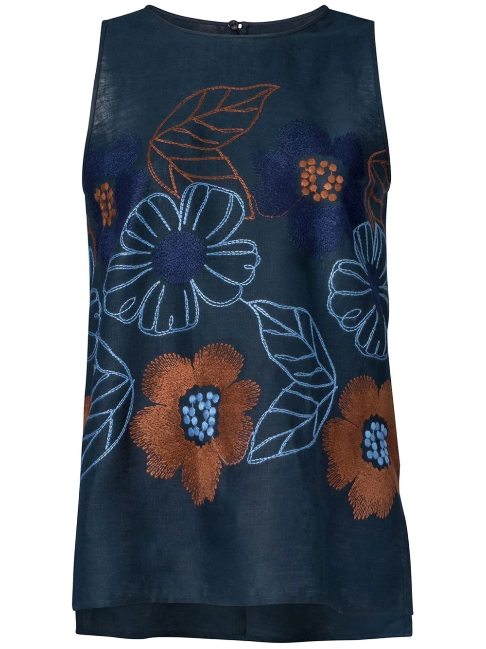 Leonora blouse Highlights - Navy blue - Linen/flax - Single rear button fastening - Floral embroidery - Round neck - Sleeveless - Straight hem Imported Composition Linen/Flax 100% Washing instructions Dry Clean Only