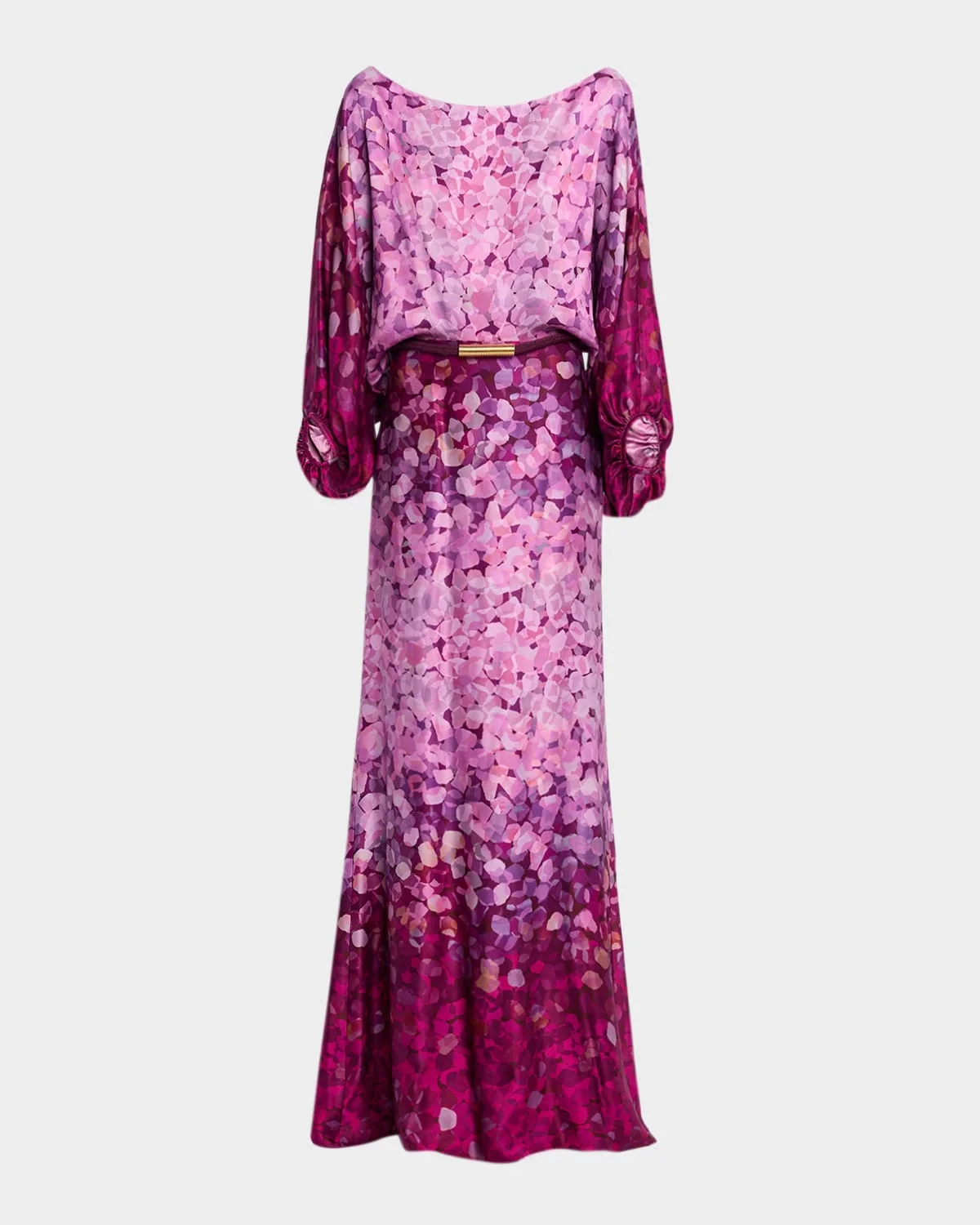 Crafted from fluid viscose, the "Lorella" dress from Silvia Tcherassi features a degrade abstract print, a billowy bodice with voluminous sleeves, and falls to a floor-sweeping A-line silhouette Off-the-shoulder neckline Long balloon sleeves; elasticized cuffs A-line silhouette Floor sweeping hem Invisible back zip Viscose Lining: Polyester Dry clean Made in Colombia Belt not included SIZE & FITModel measurements: 5 & apos;10" tallModel is wearing a US size 4/Small