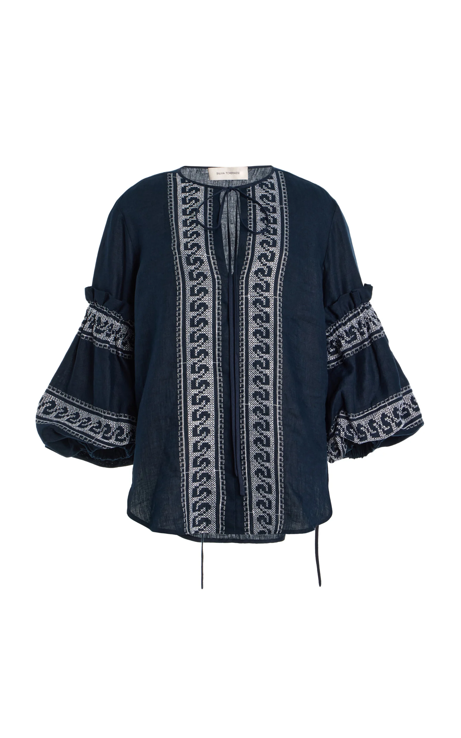 The Colombian designer crafts whimsical and feminine pieces that are imbued with unique stories rooted in her Latin upbringing. Voluminous sleeves, Criss-cross detailing. PRODUCT DETAILS - Pre-Fall '25 - Self-tie at the nape of neck - Composition: 85% Linen, 15% Polyester - Dry clean - Imported