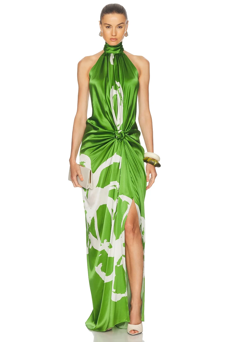 Details - 94% silk, 6% elastane - Made in Colombia - Dry clean only - Unlined - Halterneck tie-up closure - Hidden back zipper closure - Gathered fabric detail at front - Satin fabric with front slit - Our Style No. STCH-WD121 - Manufacturer Style No. ST250138