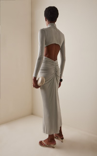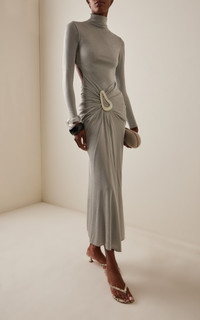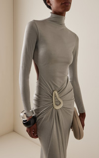 The Colombian designer crafts whimsical and feminine pieces that are imbued with unique stories rooted in her Latin upbringing. Midi dress. Italian fabric. High neckline. Fitted bodice. Resin embellishment at the front. Draped skirt. Slim fit. PRODUCT DETAILS - Fall '25 - Back zipper - Composition: 71% Viscose, 14% Polyester, 9% Polyamide - Dry clean only - Made in Colombia SIZE & FIT - Model is 5’9’’ and wears a size XS