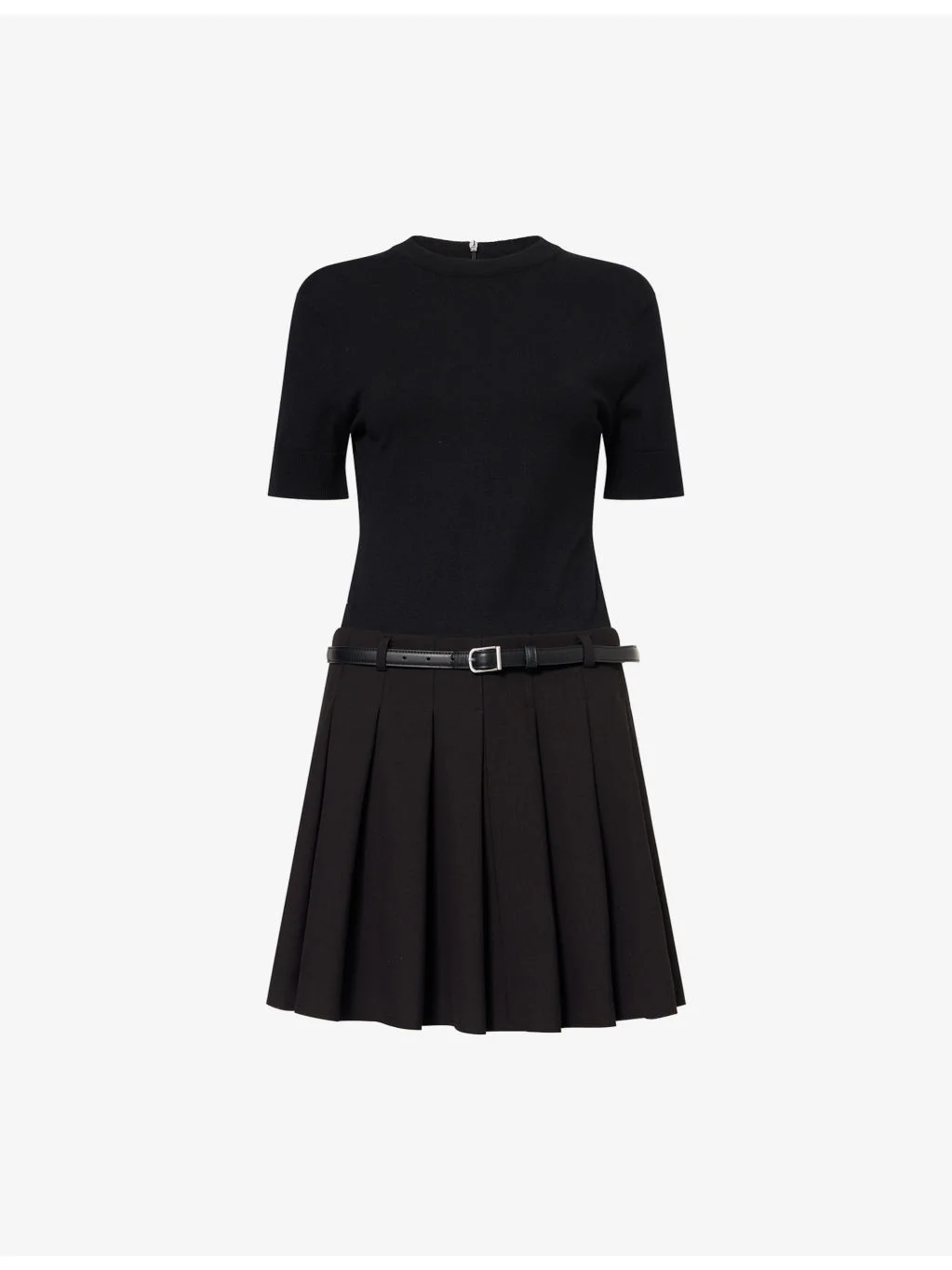 PRODUCT DETAILS - Simkhai stretch-knit mini dress - 65% polyester, 33% rayon, 2% elastane - Concealed zip fastening at back - Short sleeves, round neck, knitted top, woven pleated skirt, adjustable belt at waistband, two slip pockets at side, lined skirt - Dry clean - True to size - Model is 5ft 10in/1.78m and wears a size small - Midweight, slight stretch Ref: R04565589