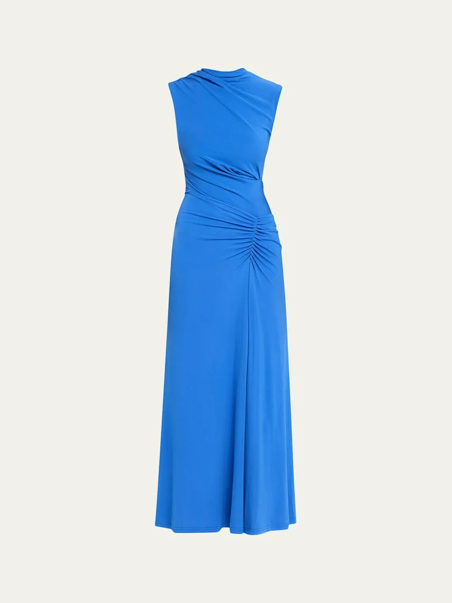 SIMKHAI "Acacia" matte crepe dress adorned with soft gathering that flatters the waist High neckline Sleeveless Aline silhouette Full length Slipover style Rayon/cellulose acetate/spandex Dry clean Imported