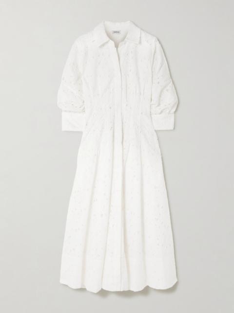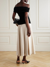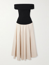 SIMKHAI's 'Adaline' dress is designed with a black recycled satin-jersey bodice contrasted by a beige linen-blend skirt. It sits elegantly off the shoulders and has a gathered dropped waist that enhances the floaty shape. Wear yours with kitten heels or flats. Size & Fit - Fits true to size, however those who are between sizes should take the smaller size - Designed to be fitted at the bust and waist, loose at the hip - Mid-weight knit with non-stretchy panels - Model is 177cm/ 5'10" and is wearing a size XSmall Model measurements: - Bust: 80cm/ 31.5" - Waist: 60cm/ 23.5" - Hip: 89cm/ 35" Details & Care - Beige linen-blend, black recycled satin-jersey - Slips on - Fabric1: 51% linen, 46% rayon, 3% elastane; fabric2: 83% recycled viscose, 17% polyester; lining: 100% polyester - Machine wash
