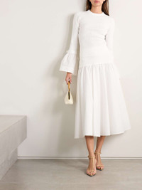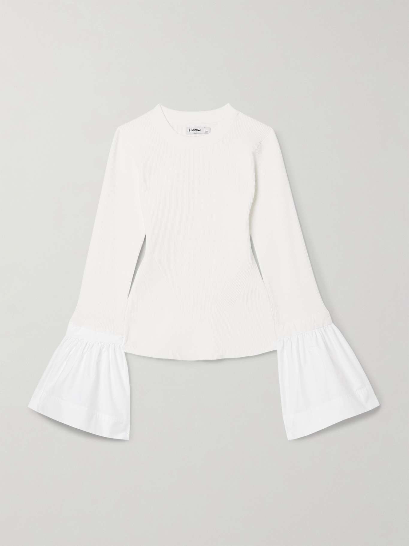 Simkhai's modern, refined separate will elevate any outfit. Made from ribbed-knit, this 'Agata' top has bell-shaped cotton-poplin cuffs decorated with pretty bows at the back. Style yours as part of a tonal look. Size & Fit - Fits true to size, take your normal size - Designed for a slim fit - Mid-weight knit - Model is 180cm/ 5’11” and is wearing a size XSmall Model measurements: - Bust: 81cm/ 32” - Waist: 62cm/ 24.5” - Hip: 88cm/ 34.5” Details & Care - White ribbed-knit and cotton-blend poplin - Slips on - Fabric1: 83% viscose, 17% elastane; fabric2: 63% cotton, 37% polyester - Machine wash