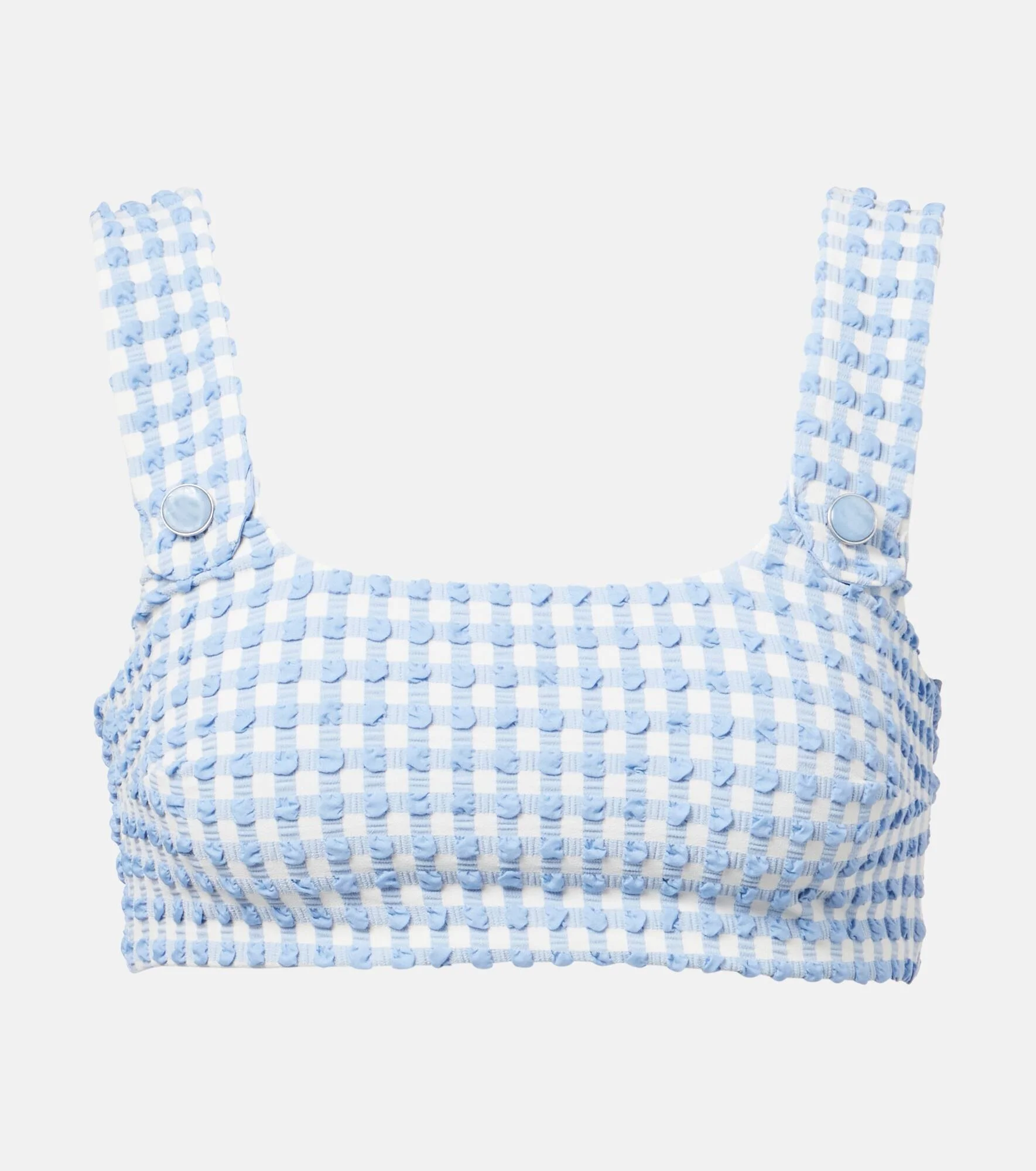 Taking inspiration from sculpture and architecture, Simkhai's impactful designs combine innovative construction with hand-detailing. The Ainsley bikini top features a gingham pattern all over and decorative buttons at the front. Product Details - Material: 93% polyester, 7% elastane - Care instructions: hand wash - Made in China - Designer color name: Blue Hydrangea Gingham - Item color: blue - Lining: 85% nylon (recycled), 15% elastane - Item number: P01053100 Size & Fit - True to size - Unpadded Top - The model seen in the picture is 178cm-5'10", cup size B, and wearing a size XS